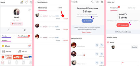 En 'Amigos' podrás ver cuantos amigos tienes y enviar votos a todos tus amigos dando click en el botón azúlEn 'Solicitud de amigos' podrás ver tus solicitudes de amistadEn 'Buzón' podrás reclamar los vts que te envían tus amigos